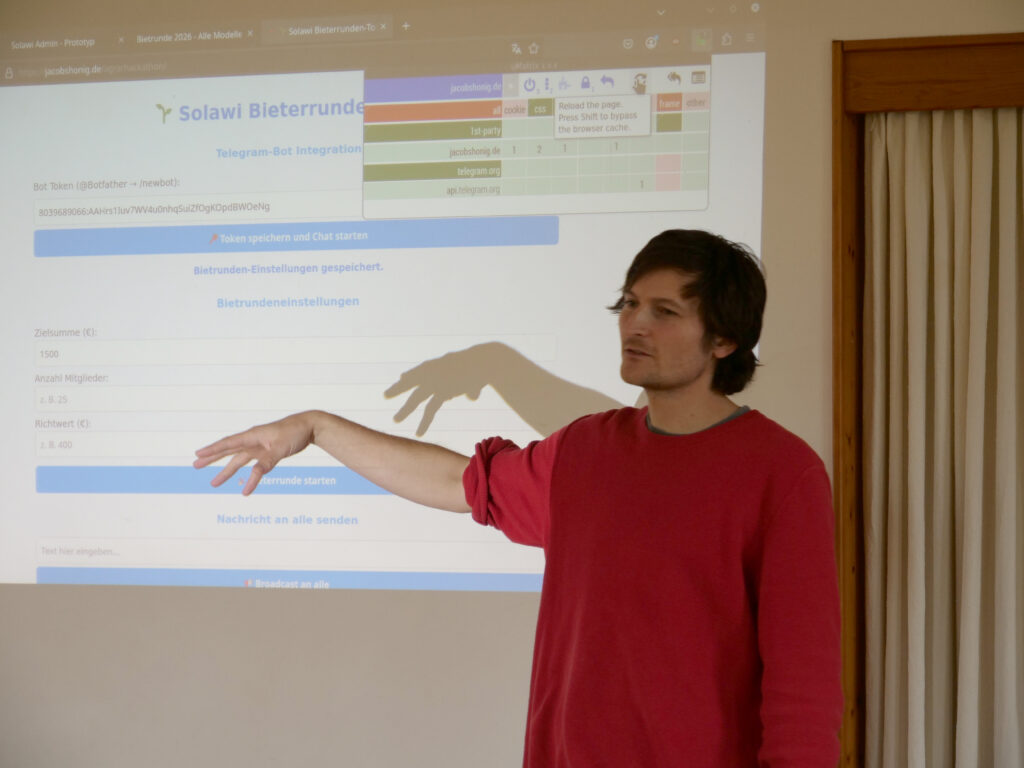 Das Wochenende brachte auch viele schöne „Nebeneffekte“. So trafen sich zwei Schweizer Software-Initiativen, die je eine umfangreichere Plattform für die verschiedenen Bedürfnisse ihrer Solawis entwickelt hatten, zum ersten Mal bei unserem Hackathon.