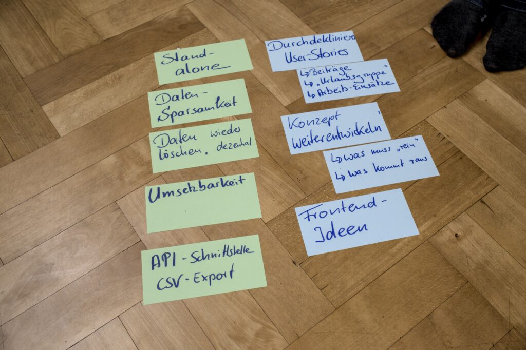 Am Samstag konnten wir dann richtig starten. Der Tag verlief im „Flow“, denn zur Steigerung der Kreativität und Nutzung produktiver Arbeitsphasen hatten sich die Teilnehmenden gewünscht, möglichst wenig feste Zeiten zu verabreden. In drei Räumen saßen Kleingruppen zusammen, feilten an Konzepten oder arbeiteten schon direkt am Code hinter ihrem Laptop. Immer wieder rückte eine kleine Gruppe enger zusammen, tauschte die gerade weiterentwickelten Ideen aus oder schaute im Nachbarraum vorbei, um zu hören, wie es dort voran ging. Jede Gruppe profitierte immer wieder von den Erkenntnissen der anderen oder bezog die Bedarfe der anderen Gruppen mit in ihre Arbeit ein. Unterbrechen ließen wir uns nur durch die leckere Pizza, die uns aus der Kommunarden-Küche gebracht wurde.