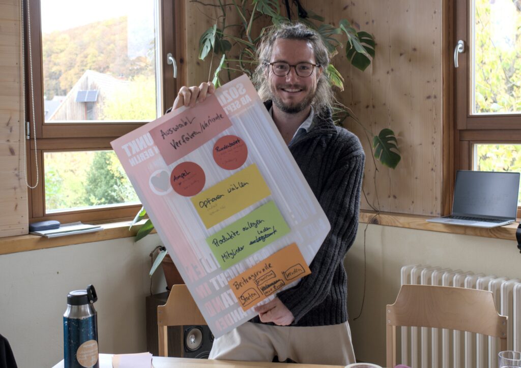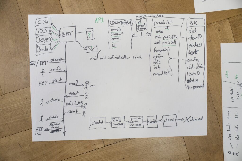 Eine andere Kleingruppe beschäftigte sich mit dem, was Nutzer:innen auf ihren Bildschirmen sehen würden. Weil Solawis sich so sehr voneinander unterscheiden, muss eine Person am Anfang festlegen, ob hier eine oder mehrere Runden mit Geboten stattfinden sollen, ob verschiedene „Produkte“ auf dem Bildschirm erscheinen sollen oder nur „pro Ernteteil“ eine einzige Summe angegeben werden muss. Um all diese verschiedenen Fälle später abzubilden, wurde eine Übersicht mit den möglichen Optionen erarbeitet. Wichtig für unsere Gruppe war hierbei, dass wir eine langjährige Gärtnerin der Solawi Niederkaufungen dabei hatten, die immer wieder auch die Realität aus dem Solawi-Alltag mit einbrachte.