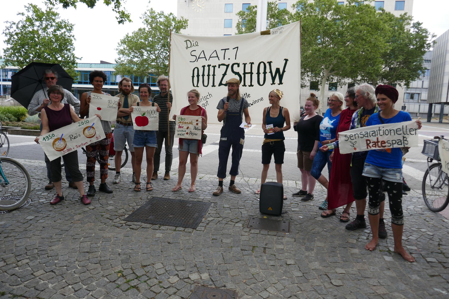 In Wolfsburg erwarten uns schon Journalistinnen beider Tageszeitungen – fix packen wir unsere Requisiten aus und rufen die Passant*innen auf, am Saatgut-Quiz teilzunehmen. Sie tun es. Eine schöne Abwechslung, dass wir nach vielem Zuhören einmal als Gruppe gemeinsam etwas erzählen bzw. darstellen. Es geht um den Zugang zu Saatgut, um Besonderheiten des Sortenrechts und den Wunsch, möglichst große Vielfalt zu erhalten.